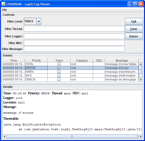 Application Swing Chainsaw pour visualiser les logs formatées par un XMLLayout ou émises par un SocketAppender |