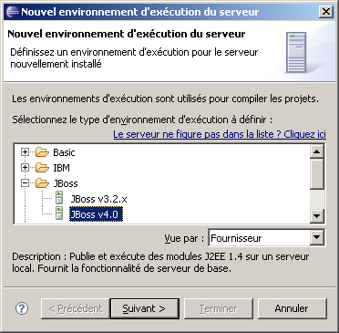 Sélectionnez le type de serveur « JBoss / JBoss v4.0 » dans l'exemple de cette section et cliquez sur le bouton « Suivant ».